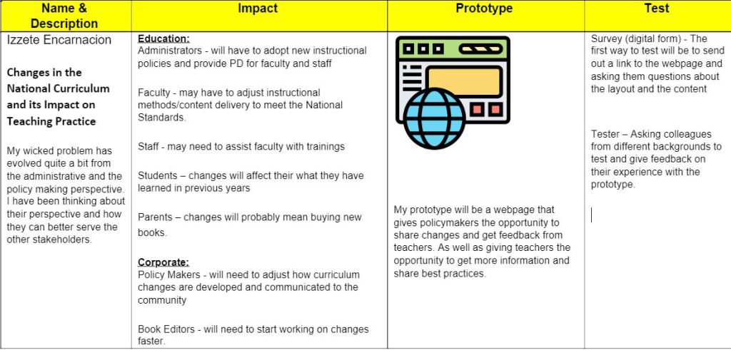 For this part of the process, I have worked on a chart that shows how my wicked problem has evolved, what I have prototyped and how I will test it.